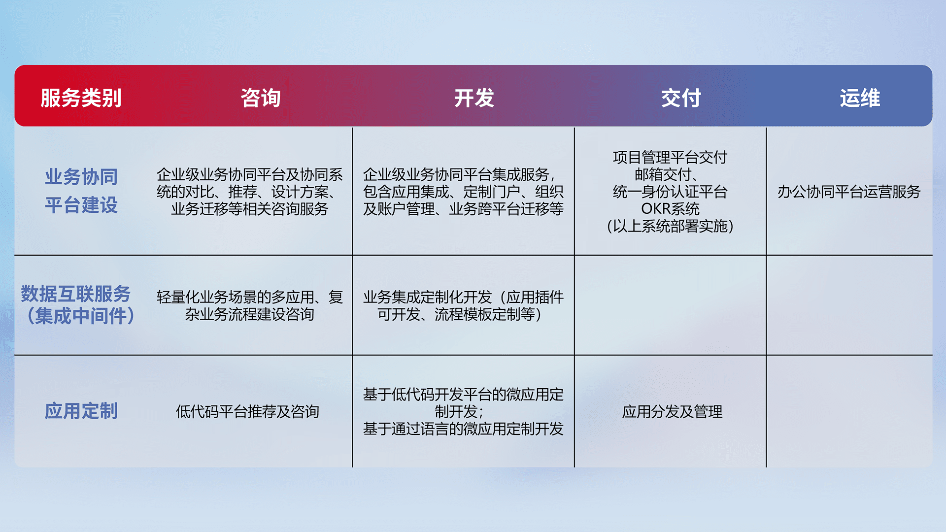 针对钉钉、、、企微、、IDaas等平台级产品提供产品的规划、、、方案、、、、交付、、定制化开发等服务,,,实现如统一协同办公、、、、智能客户服务、、、、混合会议管理、、、智能数据查询、、、等业务场景,,,,实现数字化转型。。