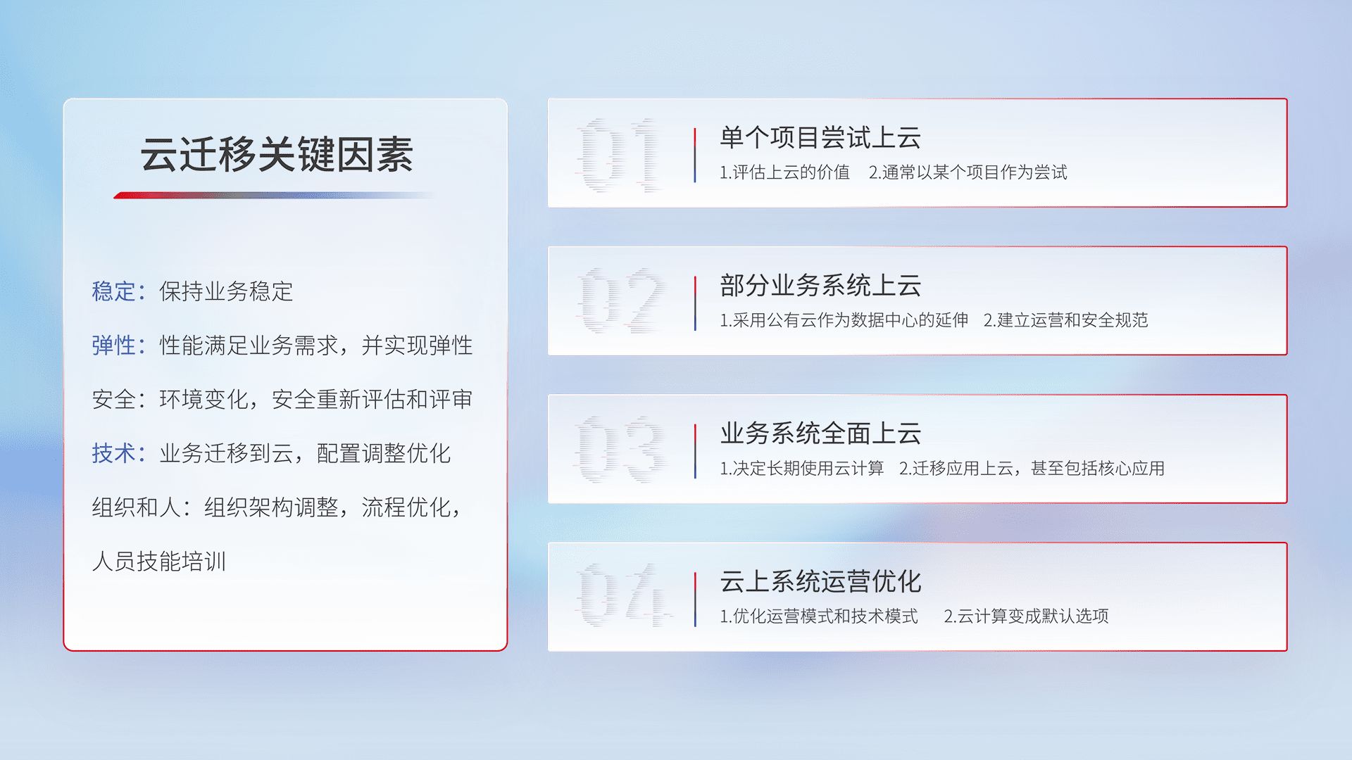 结合实际业务,,,,从规划设计、、、、云平台选型、、、云原生改造、、数据迁移、、集成交付,,迁移全过程为客户识别最佳上云路径,,,做好风险识别管理,,,设计网络架构、、、、身份权限、、、安全审计合规、、、、操作审计、、日志审计、、、监控告警策略、、多站点容灾设计等,,,,对云上基础设施进行整体规划,,,提升IT治理水平,,以满足弹性、、、高可用、、、、高性能的需求。。。