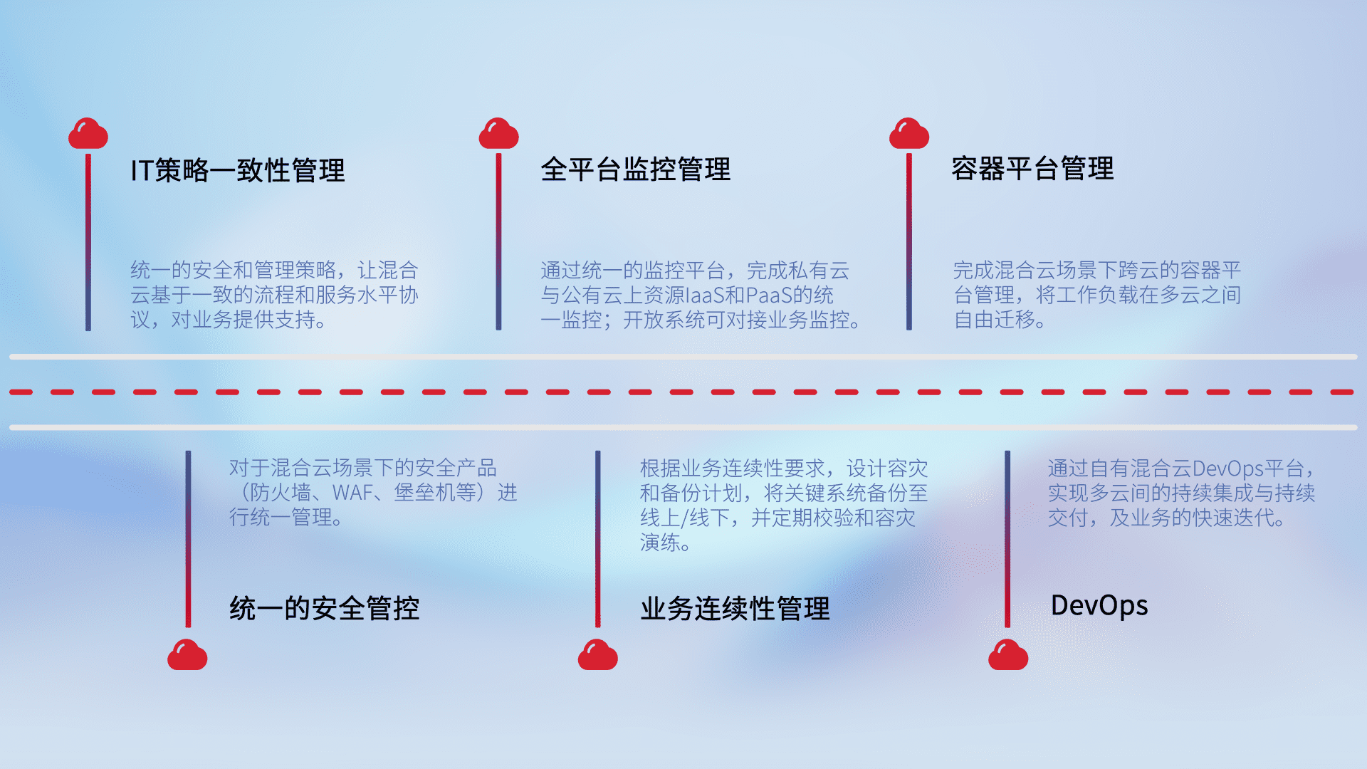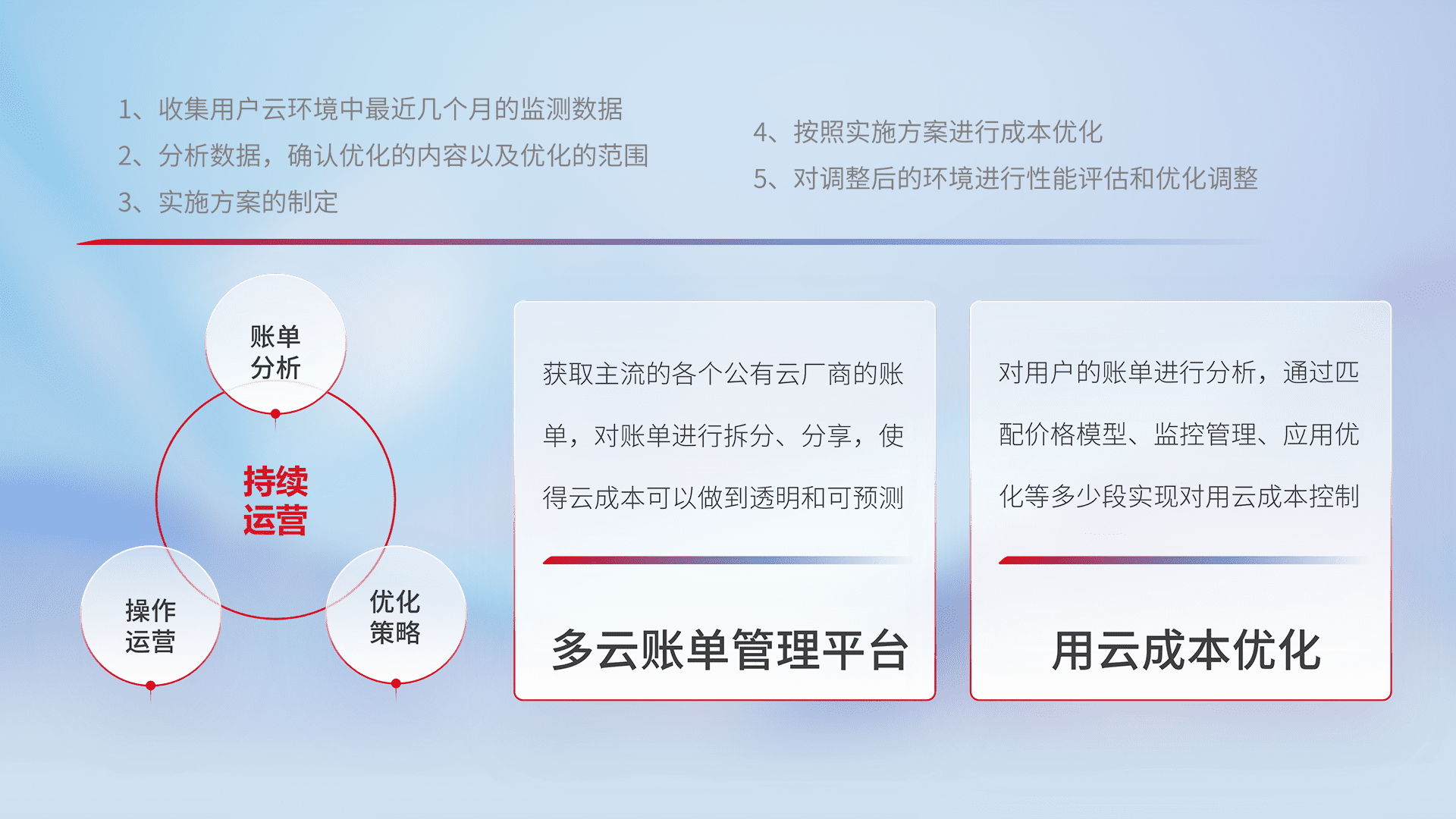 通过多云纳管,,以统一的资源数据模型把客户的云资源进行抽象和封装,,进而实现对多云资源的统一操作,,,保障云资源管理的可靠性、、稳定性与可用性。。。量身定制化运维内容,,,配置、、开发运维、、补丁管理、、备份、、、、监控、、、、认证和访问管理、、、、审计和日常巡检等,,,,保障在用云过程中的可靠度,,,稳定度以及高可用率。。。。