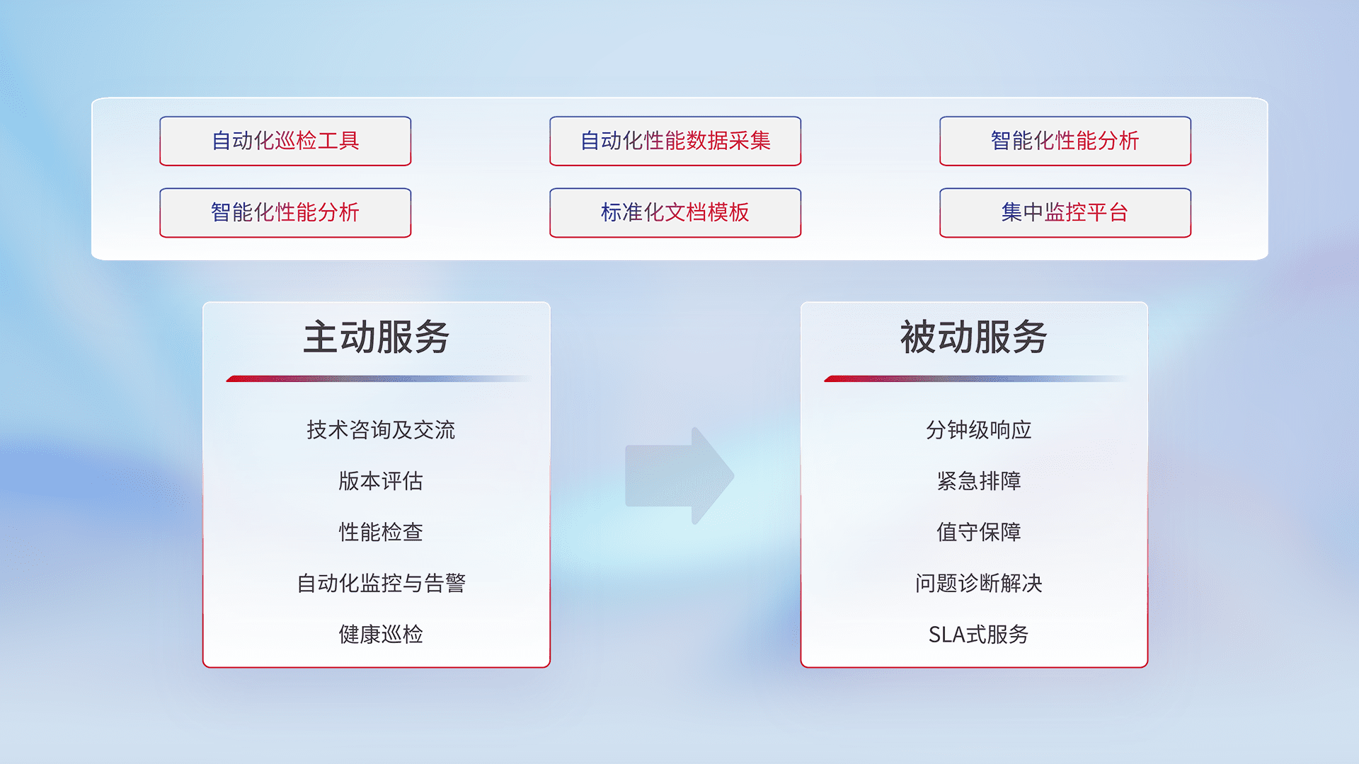 智能化工具和标准化文档,,保障服务质量,,,提供主动服务(包含技术咨询、、版本评估、、性能检查、、、自动化监控与告警、、、、健康巡检)和被动服务包含(分钟级响应、、、紧急排障、、值守保障、、问题诊断解决、、、、SLA服务)。。。。