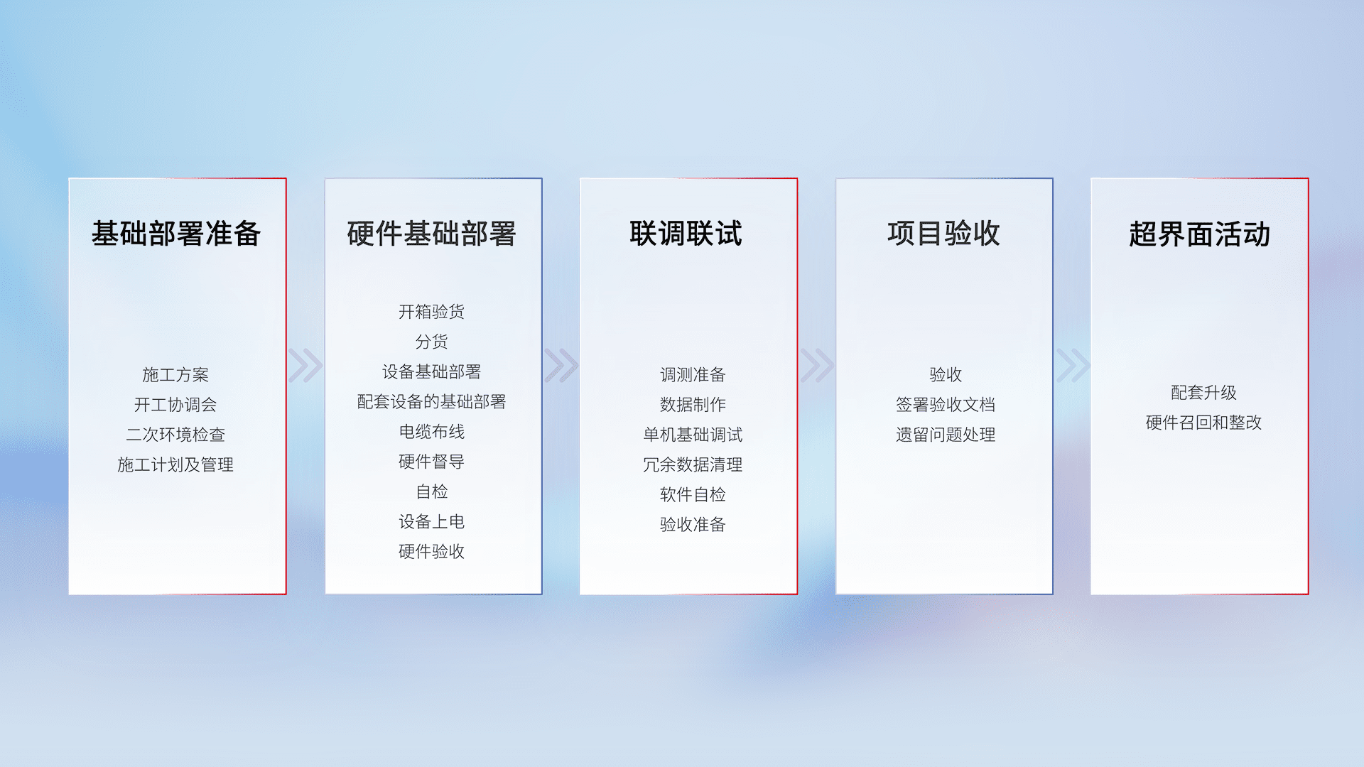 从基础部署准备、、、、硬件基础部署、、联调联试、、项目验收、、、、越界面活动的全过程可追溯,,保证施工质量和进度。。。